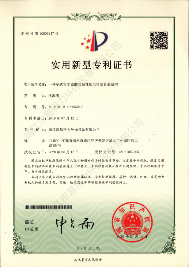 專利證書本公司坐落于開放開發(fā)超前城市江蘇靖江,我們精良優(yōu)秀設(shè)計團(tuán)隊始終遵循著創(chuàng)新超越的理念,贏得了中外合資企業(yè)的信賴。易得力環(huán)保設(shè)備有限公司與上海環(huán)科院等科研單位保持合作關(guān)系,不斷加大自身的科研力量,集中了一批國內(nèi)環(huán)境科技研究和應(yīng)用方面的高素質(zhì)人才,取得多項實用新型專利證書。…… 查看更多 >>
